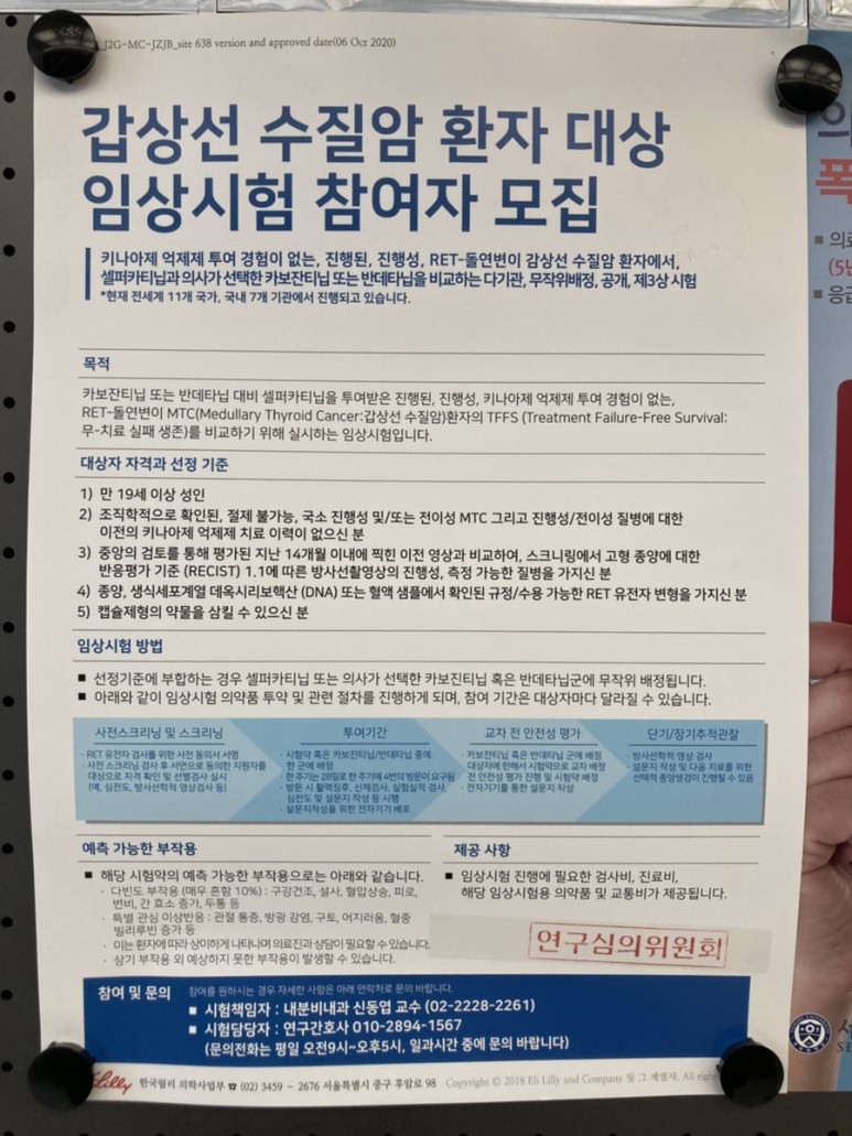 ‘4년째 #갑상샘암 수술 후 외래진료 대기하면서 보니까 갑상샘 수질암 환자 대상 임상시험 참가자 모집 포스터를 봤어요. 관심 있으신 분 보세요~