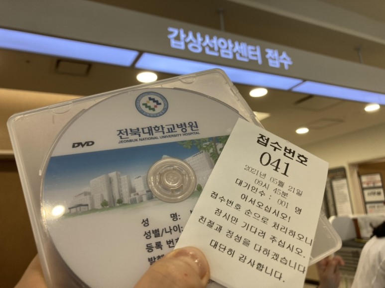 암 수술 후 4년차가 되면 며칠 전에 초음파 사진을 미리 찍어서 진료합니다 원래는 신촌세브란스병원에서 예약한 뒤 미리 영상의학과에서 초음파 촬영해 외래로 오라고 예약했는데 이번에는 정교수 학회 시간으로 진료일이 앞당겨져 전북대병원에서 미리 찍고 왔어요. 갑자기 초음파 예약날짜를 잡으면 10월에 된대ㅠㅠ 그래서 만약 예약취소자가 있으면 넣어달라고 했는데 다행히 취소자가 있어서 외래 전주날짜로 초음파 찍을 수 있었습니다. 대학병원은 초음파. MRI등 영상의학과 예약이 너무 밀려서 잘 알아봐주세요~ 병원에 오자마자 초음파영상cd원무과에 접수.
