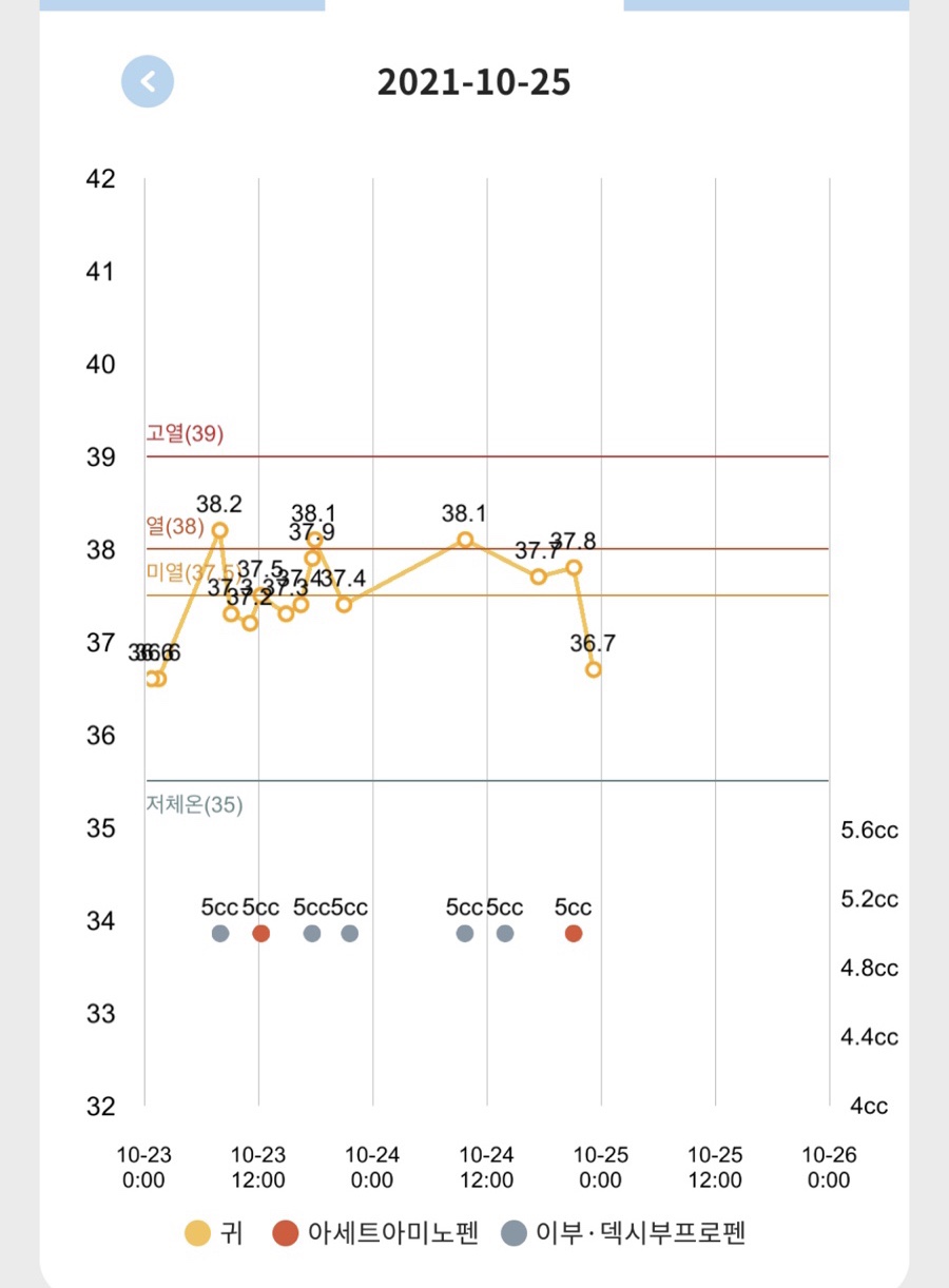 첫 번째는 조금 호전될 거라고 생각했는데, 두 번째가 고열막 아기 38도를 찍습니다.