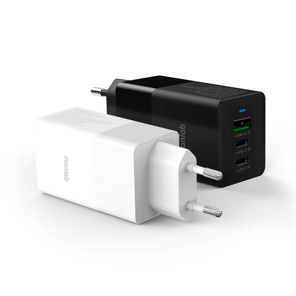 고속 멀티 충전기 만랩은 신소재 GaN이 내장돼 있어 크기가 작고 가벼운 사이즈로 열이 발생하는 발열은 줄이고 Type C 2대, USB 1대를 지원하며 동시에 아이폰, 맥북, 노트북 3대까지 충전할 수 있습니다.