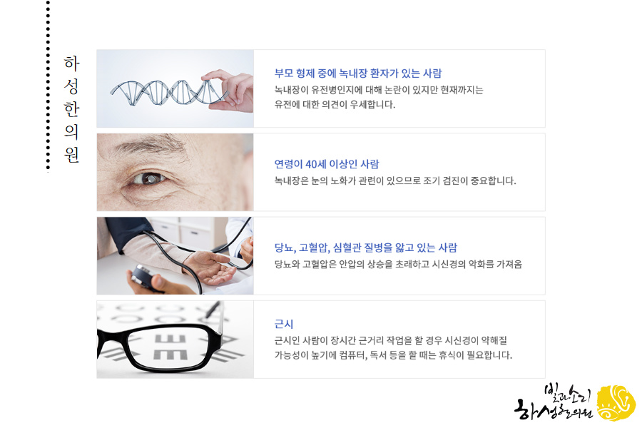 현재 높은 안압으로 고민이시거나 녹내장으로 안압 정상수치 관리에 대해 궁금하신 점, 녹내장 한방치료에 대해 궁금하신 점은 아래 하성의원의 신속한 전화상담을 통해 연락처를 남겨주시면 신속하게 도와드리겠습니다.