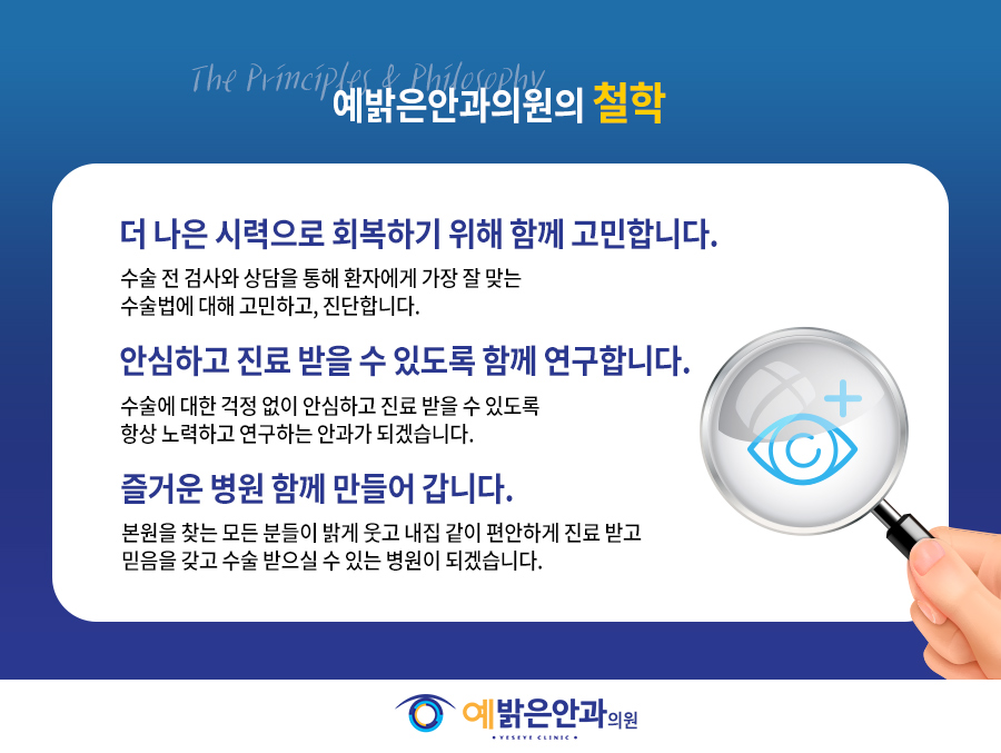 예바른안과의원에 내원해주시는 여러분이 보다 건강한 눈으로 세상을 볼 수 있도록 시력회복을 중점으로 진료상담을 이어가고 있습니다.