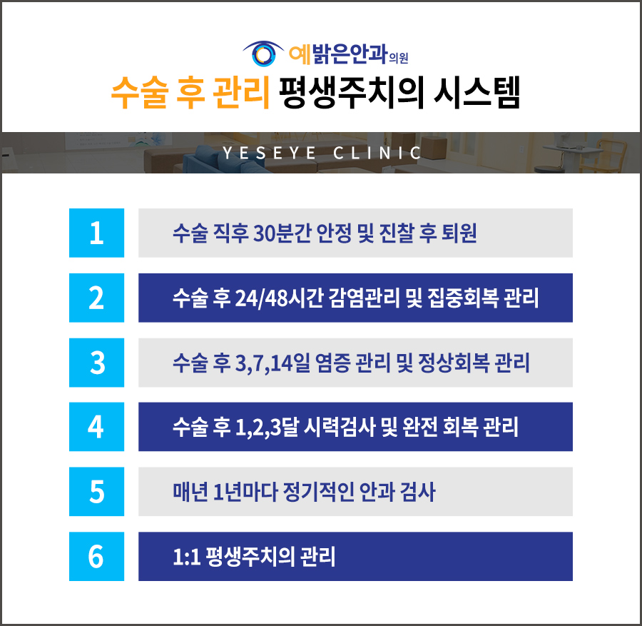 또한 수술 후에도 치료를 담당한 의사가 안전하게 시력회복을 할 수 있도록 꾸준히 사후관리를 해줄지도 반드시 체크해야 합니다.