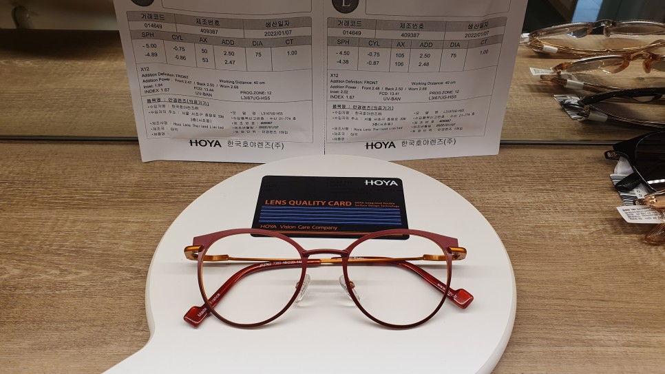 완성된 안경을 쓰고 위화감은 있지만 현기증은 없다고 하셨습니다 중간 거리에 가까운 거리까지 보일 수 있고, 거리에 따라 선명하게 보이는 것이 신기했습니다. 멀리서 보기에도 훨씬 시원하고 예뻐보인다고 합니다. 다초점 안경의 성공을 위한 포인트는 정확하고 정확한 검안에서부터 시작합니다. 정확한 시력 검사 후 검안경으로 다양한 다초점 렌즈를 체험해 보고 결정할 수 있습니다.