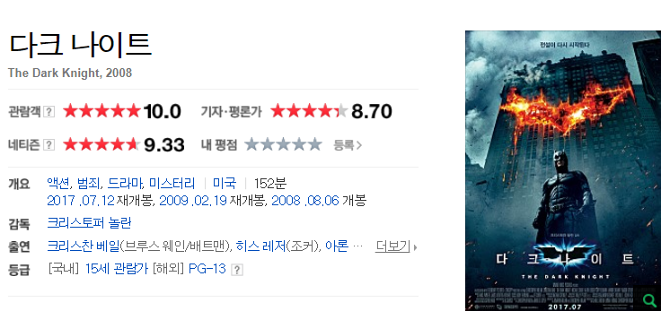 다크나이트 감독 크리스토퍼 놀란 출연 크리스찬 베일, 히스 레저, 아론 에크하트 개봉 2008.08.06./2009.02.19. 재개봉/2017.07.12. 재개봉/2020.07.01. 재개봉