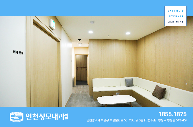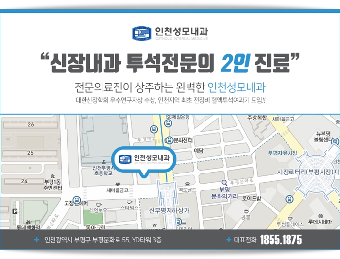 인천성모내과의원 Info.Address. 인천광역시 부평구 부평문화로 55, YD타워 3층 (지번 : 인천광역시 부평구 부평동 543-45) Tel.1855-1875