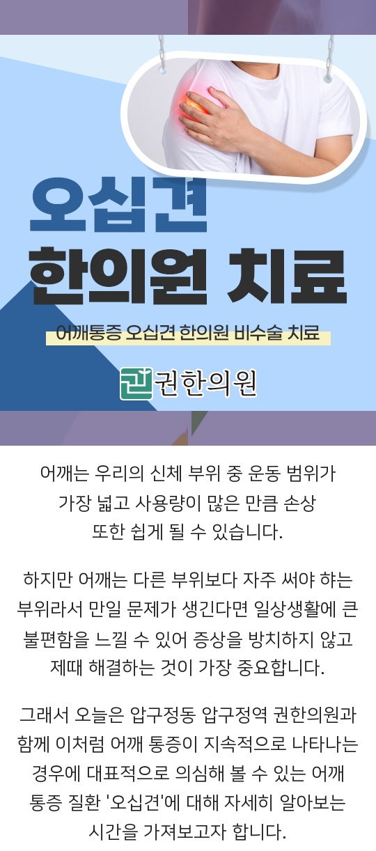 여기서 중요한 것은 어깨가 우리 몸에서 가장 잘 움직이는 관절 중의 하나라는 것입니다. 잘 움직인다는 것은 다치기 쉽다는 단점도 있습니다. 어깨가 외상으로 인해 다칠 수도 있는데 만성적으로 어깨와 목이 뻐근하고 딱딱해지는 증상이 오래 지속되면 어깨 관절을 지탱하고 있는 근육이 스트레스를 받게 되고 이 근육과 관절의 연결 부위, 대표적으로 회전근개근육과 힘줄 등이 약해지고 염증과 회복을 반복하면서 섬유조직, 석회화조직 등 상처조직이 점점 쌓이게 되고 이것이 누적되어 오십견이 됩니다.오십견 치료 오십견에 대한 대부분의 치료는 관절의 가동 범위를 유지하고 통증을 최소화하는 데 중점을 둡니다.오십견은 통증이 심한 오십견과 관절 운동 제한이 주요 증상인 오십견으로 나눌 수 있습니다.통증이 심할 경우 다시 열감, 부종 등의 염증 소견이 있는 경우와 수면 중 야간통증으로 나뉘는데, 염증 소견이 있는 경우 먼저 염증치료를 한 후 관절운동 제한을 푸는 치료를 해야 하며, 염증 소견 없이 야간통증이 우선되는 경우 그 원인을 찾아 통증을 먼저 제거해야 합니다.
