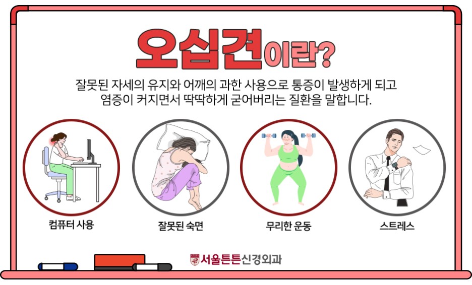 폭염이 점점 다가오고 있는 5월의 끝자락으로 많은 사람들이 더운 여름을 잘 보내기 위해 준비를 하고 있지만 추웠던 겨울이 지나고 실내에서만 생활하던 사람들은 밖으로 외출하게 되어 그동안 하지 못했던 운동이나 야외활동을 시작하게 됩니다. 문제는 오랫동안 사용하지 않던 근육을 갑자기 많이 사용하면 어깨 통증이 생길 수 있다는 점입니다. 흔히 ‘오십견’이라고 부르는데, 이는 퇴행성의 변화로 인해 50대에 많이 나타난다고 해서 붙여진 이름입니다. 하지만 최근에는 발병 연령대가 다소 낮아져서 오십견 연령에 관계없이 20대와 30대에도 증상이 나타나고 있다고 해요. 마석서울튼신경외과에서 알려드립니다!