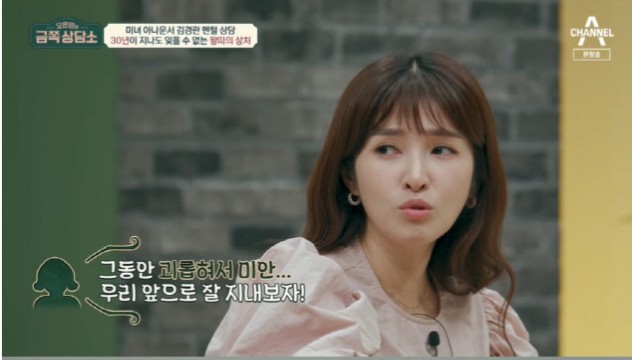 김경란은 결혼생활에 대해서는 정서적 교류가 부족했다고도 했다. 김경란은 이해하려고 노력했지만 못했다. 너무나 내 감정을 몰랐다. 나 자신에게 미안할 정도로 몰랐다고 털어놓았다. 이에 오은영은 잘못된 마음은 없다. 마음이 맞느냐고 물어볼 필요가 없다고 감정을 표현하는 연습이 필요하다고 조언했다.