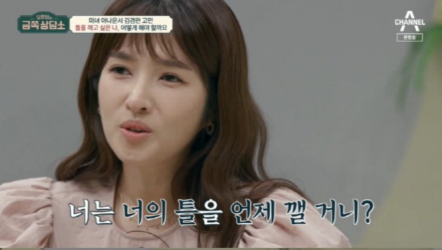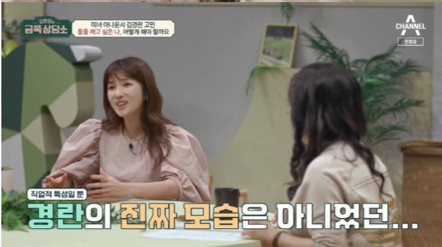 첫 번째 고객은 김경란. 김경란은 “인생에서 많이 들은 이야기 중 하나가 ‘네 개의 틀을 언제 깨느냐’였다. 그 틀이 도대체 뭔지 모르겠다며 나는 허술한 면이 많아 말을 잘 못한다. 늘 긴장하며 살아왔는데 그 모습이 각인된 것 같다고 전형적인 아나운서 이미지에 대한 고충을 털어놓았다.