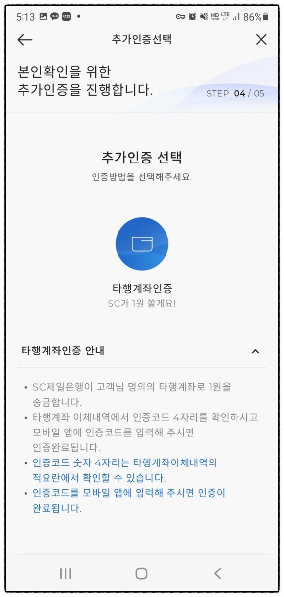 그리고 추가 인증으로 타 은행 계좌번호 1개를 적으면 sc제일은행에서 무려 1원을 보내는 인증을 합니다