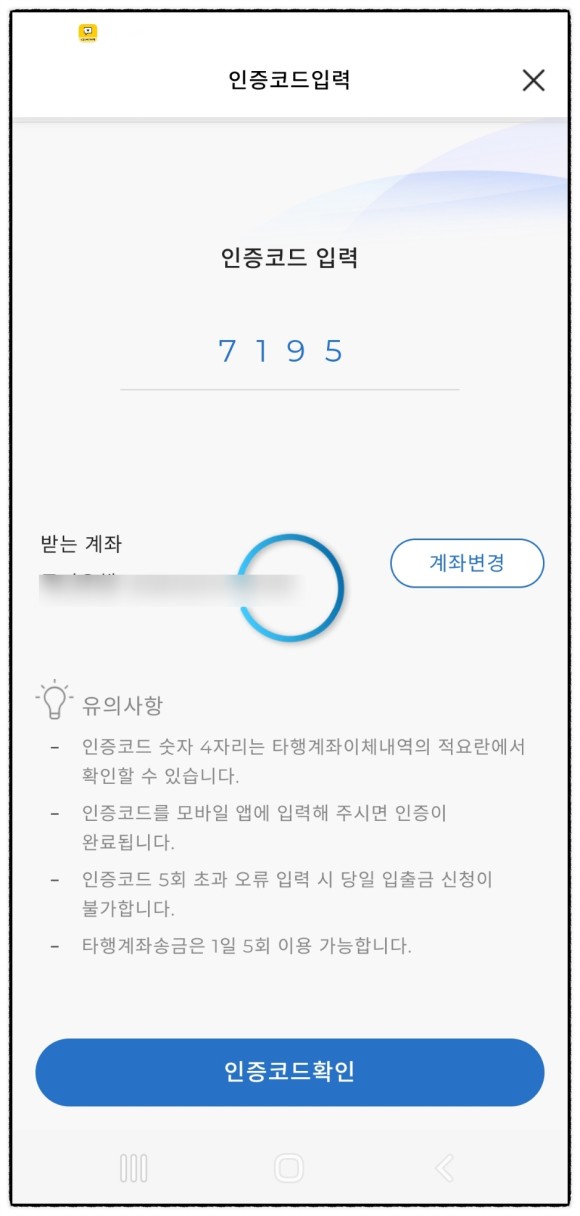 타행 계좌에서 1원을 받을 때 나오는 인증 코드를 입력합니다.