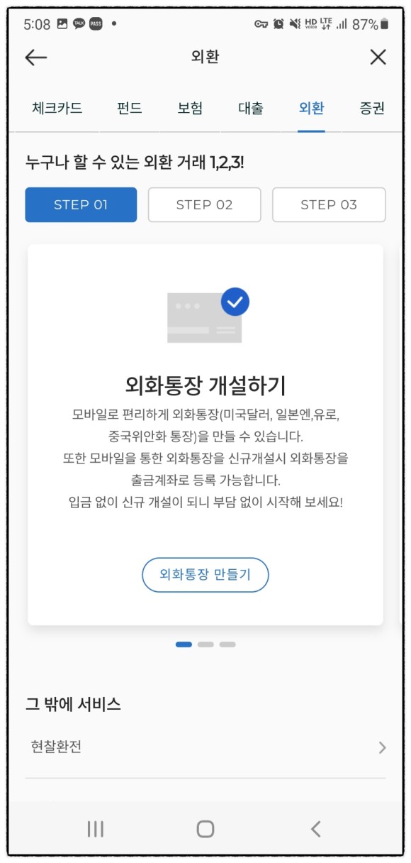 그리고 아래 사진처럼 외화통장 개설하기 – 외화통장 만들기를 터치하세요.