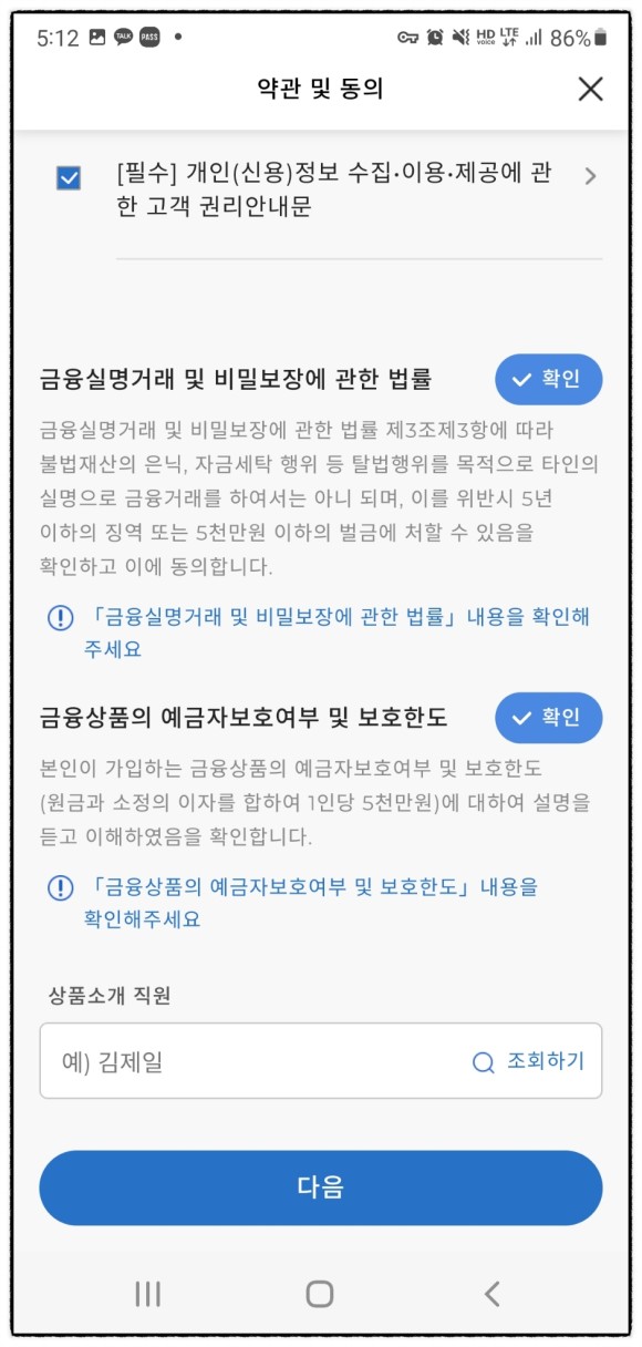 신분증을 촬영했으면 약관의 동의를 해야 하는데 확인 터치를 하고 타인에게 통장대여를 받은 사실과 같은 질문은 아닙니다.