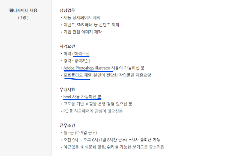 채용 형태를 살펴보면 학력에 관계없이 포트폴리오 제출이 필수입니다그리고 우대사항으로서 html의 웹코딩 언어도 할 수 있으면 우대사항으로 선택되기 때문에 웹코딩 언어도 준비해 주신다면 그만큼 높은 연봉과 취업도 더 쉽게 할 수 있다는 말씀이시군요!!