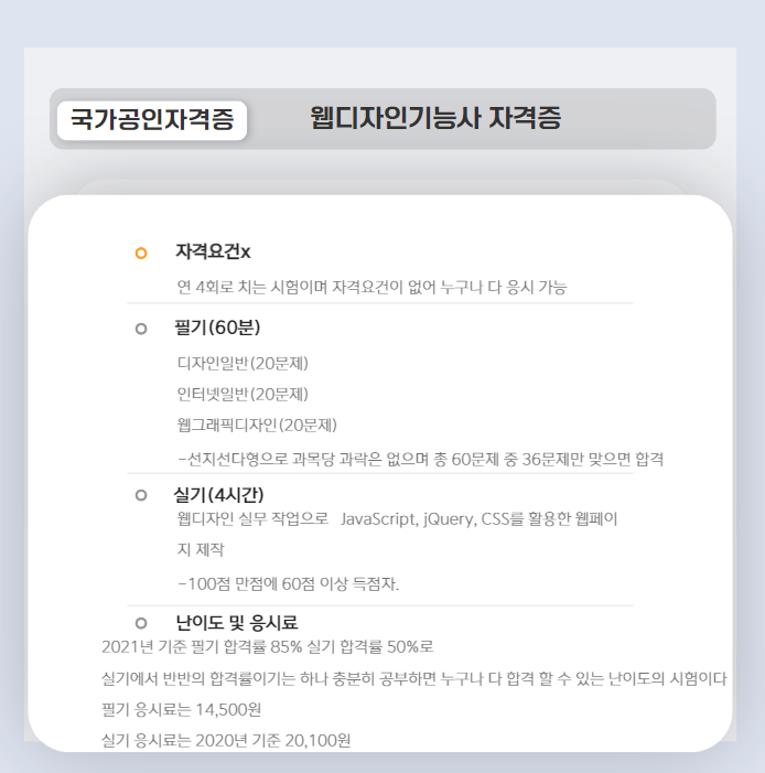 웹디자이너가 되기 위해서는? 웹디자이너가 되기 위해서는 기본적인 포토샵/일러스트는 기본으로 할 수 있고 HTML/CSS/JAVA/Jquery와 같은 웹코딩 언어를 배워야 진정한 웹디자이너가 될 수 있습니다!! 그리고 당연히 자신의 실력을 증명할 수 있는 자격증도 취득해야 합니다.