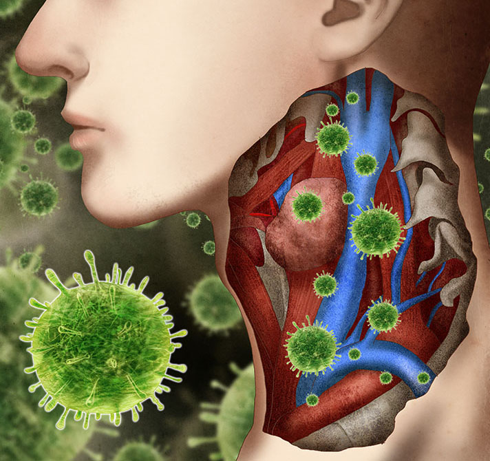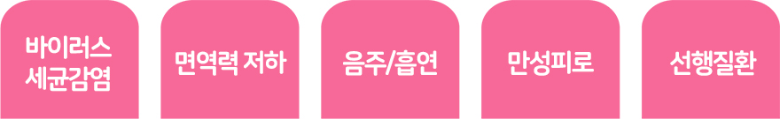 그림-1> 편도선염의 대표적인 원인 편도선은 세균 등 외부물질을 방어하는 역할을 하기 때문에 감염에 취약할 수밖에 없으며 이때 세균이 침투로 인해 병을 일으킬 경우 ‘편도선염’으로 진단하게 된다. 쉽게 말해 여러 원인으로 인해 신체의 저항 능력이 감소했을 때 편도 내 세균이 침투함으로써 급성 감염이 발생하게 된다. 면역력이 저하되는 상황은 주로 과로/피로가 심한 경우, 음주/흡연 등으로 호흡기가 약해진 경우, 면역억제 등의 약을 복용한 후 면역력이 저하된 경우 등 다양한 요인이 포함되며, 이러한 환경이 면역력을 저하시켜 외부 병원체가 활동하기 좋은 환경을 조성하게 된다.* 면역력이 약한 영아의 경우 바이러스가 원인이 되는 경우가 많고, 이후에는 세균 감염이 원인인 경우가 많다.