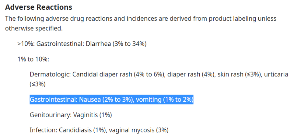 Amoxicillin-clavulanate 이상반응으로 구역질, 구토, 상복부 불쾌감이 있을 수 있습니다. 위 환자에게는 항생제 이상 반응임을 설명하고 약제를 중단시켰습니다. 그러니까 2%는 아니라고 생각하지만 체감으로는 5~10%는 된다고 생각합니다.