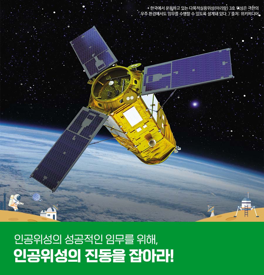 인공위성부터 적용되는 진동 저감 기술인 인공위성에는 다양한 탑재체가 실려 있습니다. 이 탑재체는 구동하면서 미세 진동을 지속적으로 발생시킵니다. 특히 위성의 자세를 제어하기 위한 장치, 전력을 생산하기 위한 태양전지판, 지구와 통신하는 안테나, 적외선 영상을 촬영하기 위해 사용되는 극저온 냉각기, 연료탱크 내 연료 등이 인공위성으로 진동을 만드는 주요 원인입니다.