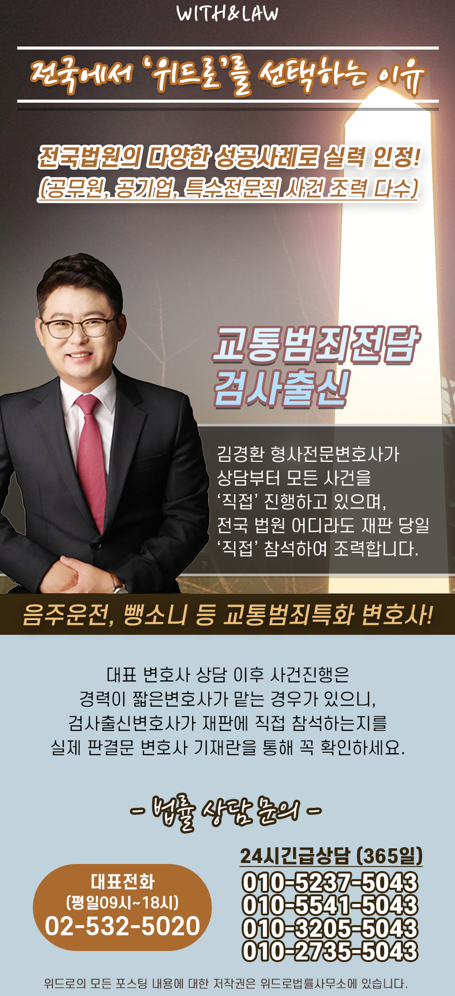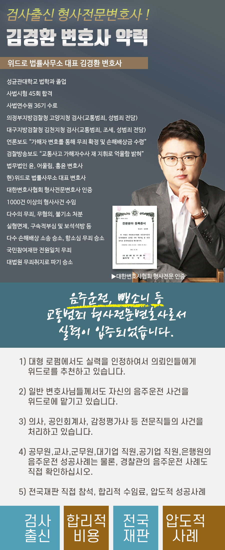 김경환 교통범죄담당 검사 출신 변호사는 검사 재직 경험을 거쳐 수년간 교통형사범죄를 다루면서 축적된 효율적인 사건 진행 노하우와 승소 사례를 바탕으로 전국 의뢰인들의 곤경에 처한 사건을 법률적으로 지원하고 있으며,