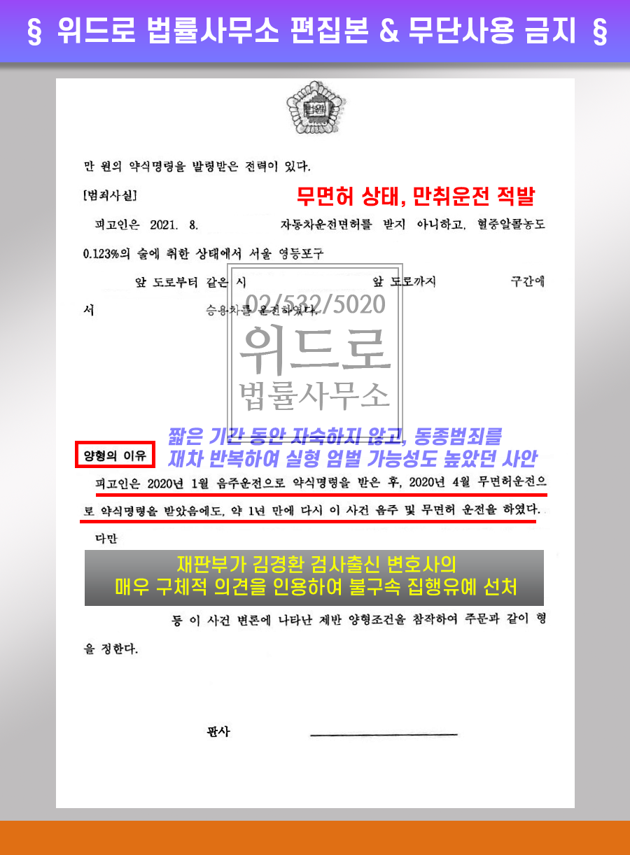 ● 서울중앙지방법원 단기간 무면허 음주운전 2회 만취운전을 하다 적발돼 실형의 위기로 집행유예 선처: 단기간 무면허 음주운전을 재범하는 행위는 검찰과 법원이 엄벌 사안으로 보고 대부분 정식 기소하는 사건이므로 주의가 필요하며, 해당 사건의 의뢰인은 만취 수준에서 술을 마시고 운전하다 신호대기 중에 잠드는 것도 필요하며, 해당 사건의 의뢰인이었던 점수로 간주하여 엄벌점이 있던 위험자 등이 연결되기도 합니다.