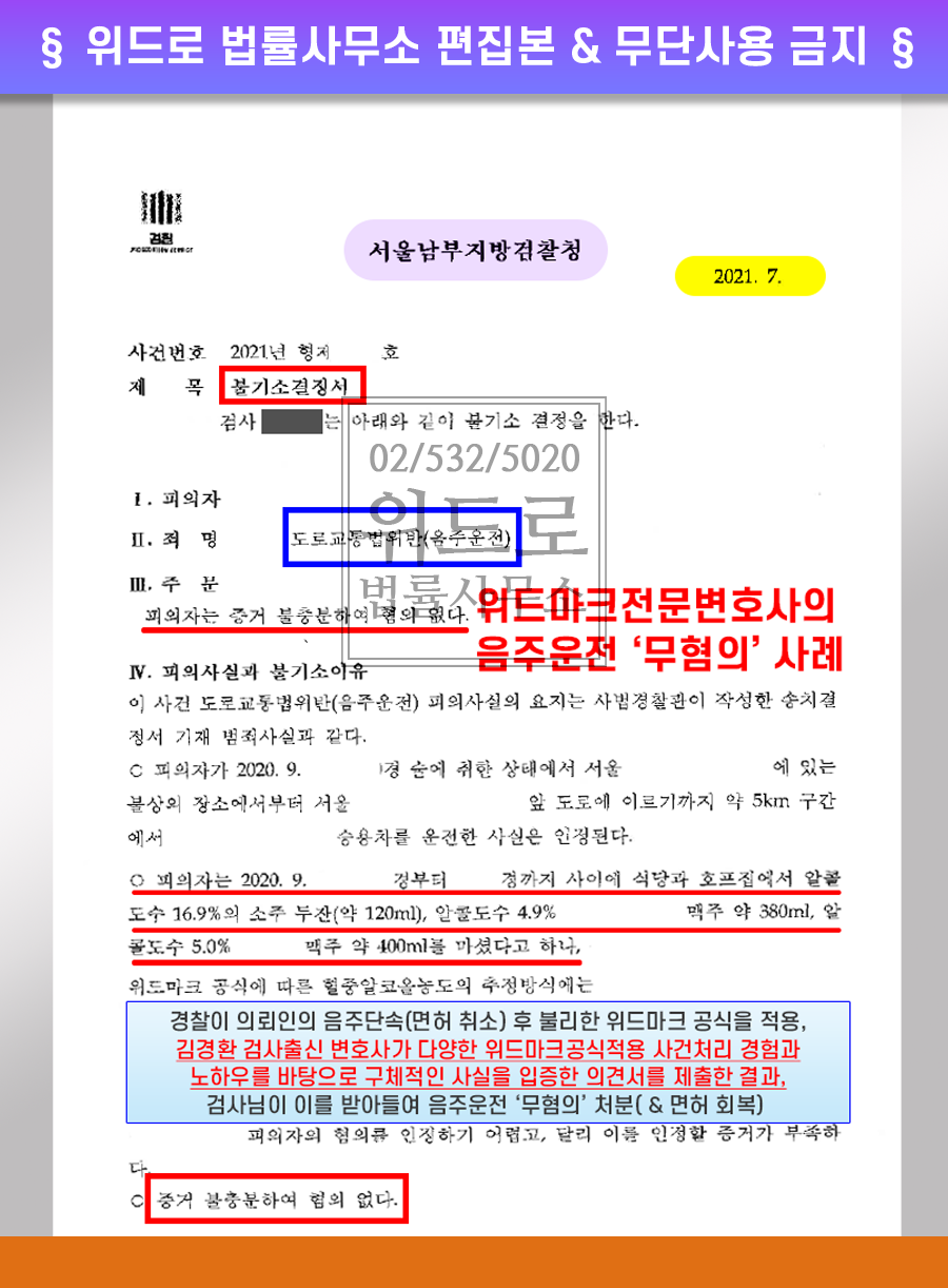 하지만 억울한 일을 겪은 의뢰인이 위즐로를 찾아 사건이 검사 출신 변호인에게 맡겨지자 위드마크 음주운전 무혐의, 무죄 성공사례도 다수 보유하고 있는 노하우를 바탕으로 수사 단계에서 경찰의 위드마크 공식 적용의 문제점을 지적하고 검찰 단계에서도 상세한 의견서를 제출하는 등 변론을 벌여 무혐의 처분을 이끌어낸 사례라고 할 수 있습니다.
