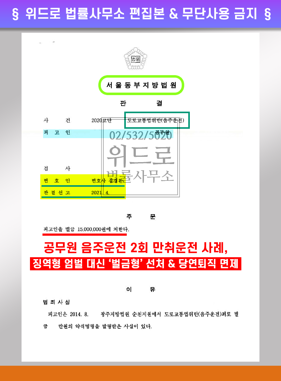 ● 서울동부지방법원 공무원의 음주투아웃(만취) 징역형 대신 벌금형의 선처로 당연 퇴직을 면한 사례 * 국가공무원법상 금고 이상의 형(징역형 집행유예 이상)을 선고받았을 경우 당연 퇴직하게 되는 불이익이 발생하므로 사건 진행에 상당한 주의가 필요합니다.