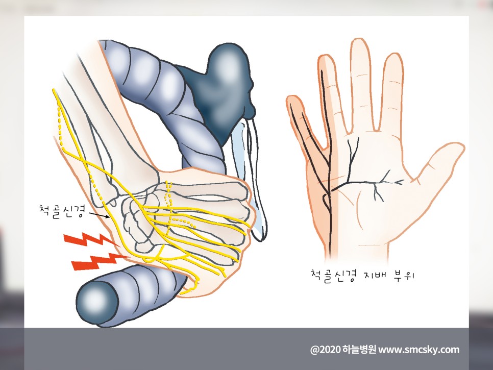 반면 작은 손가락과 네 번째 일부 손가락에 관련된 척주신경이 있습니다. 자전거를 타고 핸들을 잡을 때처럼 손목을 과도하게 구부리면 척추 신경이 압박되어 이상 증상을 보이기도 합니다. 척골신경마비 또는 핸들바 마비라고 합니다.