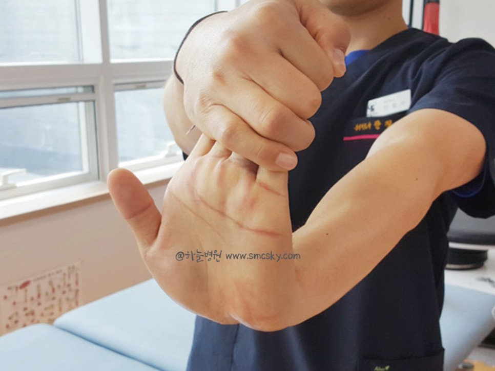 손목 하단 손바닥 상단의 중앙 부위를 정중신경이 통과하는 부위입니다 그 부위를 30~60초 정도 압박한 경우 손목 통증이나 저림이 없는지 확인합니다.