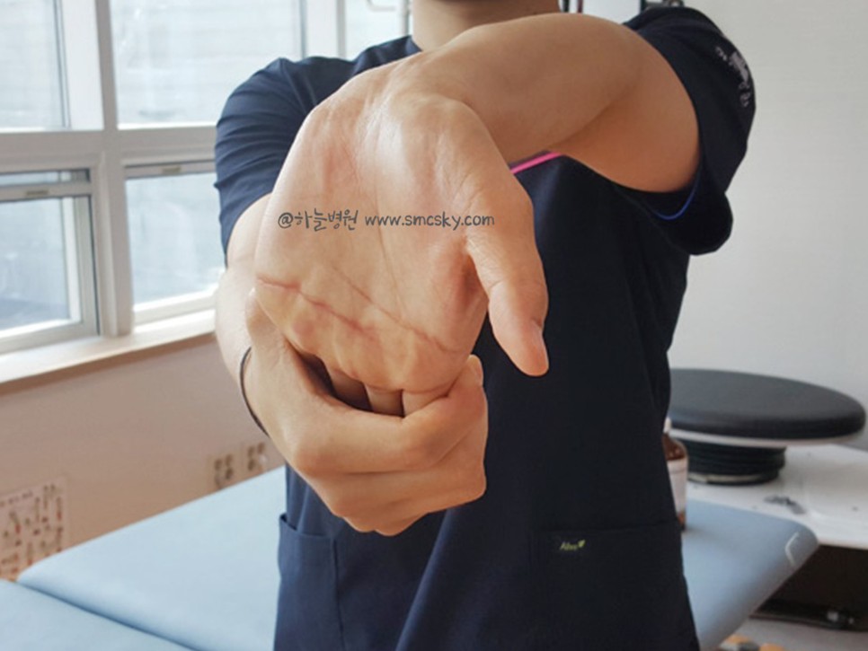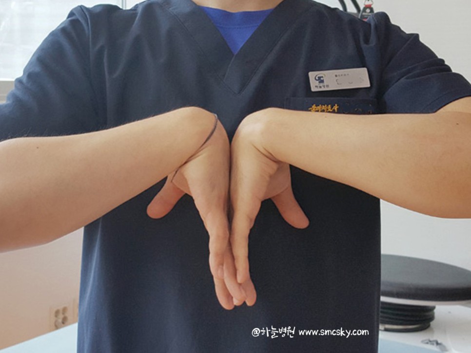 또 하나의 자가진단 방법으로 양 손목을 뒤로 젖힌 상태에서 손등을 맞대고 있습니다 30~60초 정도 유지하였을 때 손목 통증이나 저림이 있다면 의심해 볼 수 있습니다.