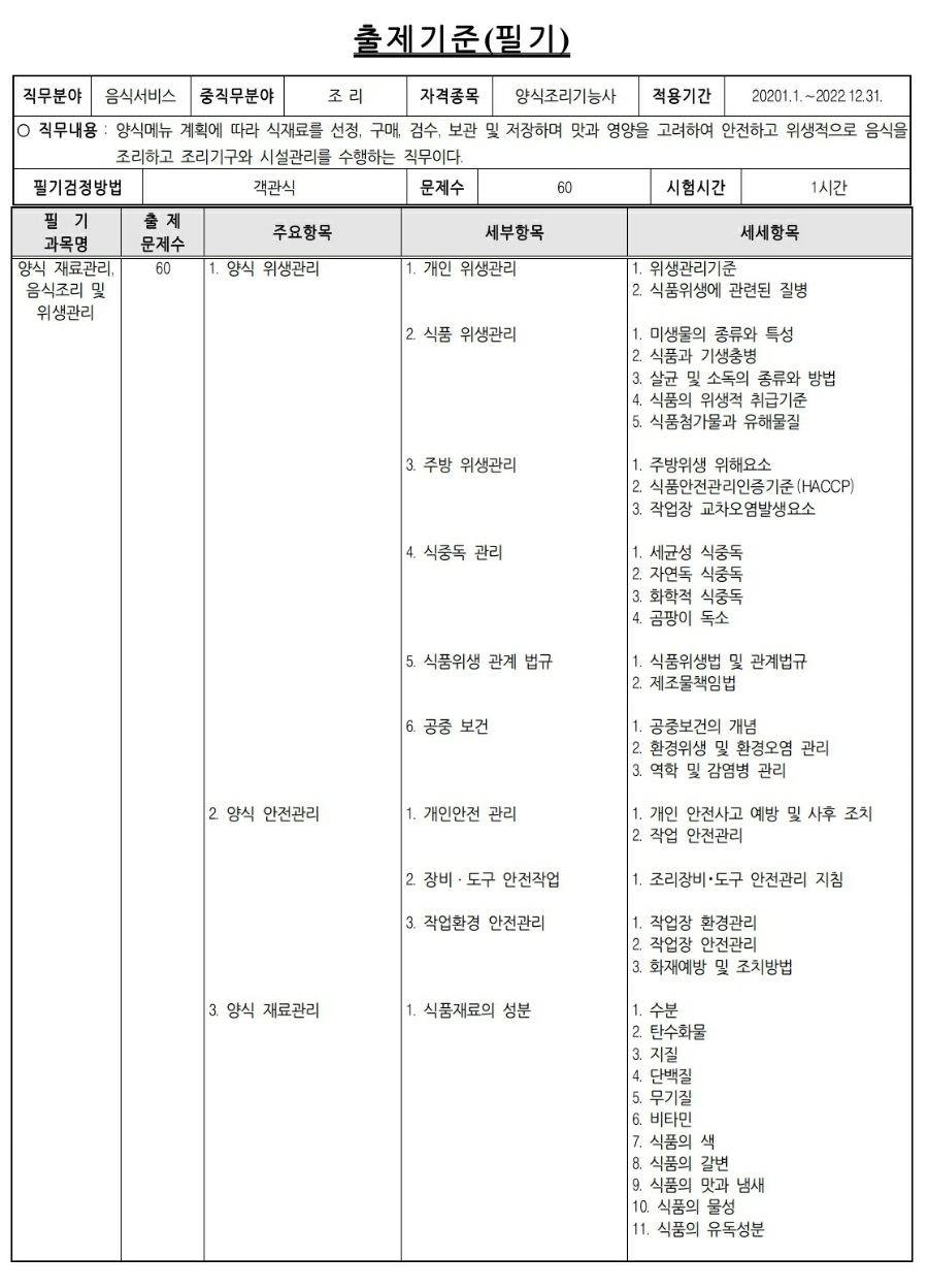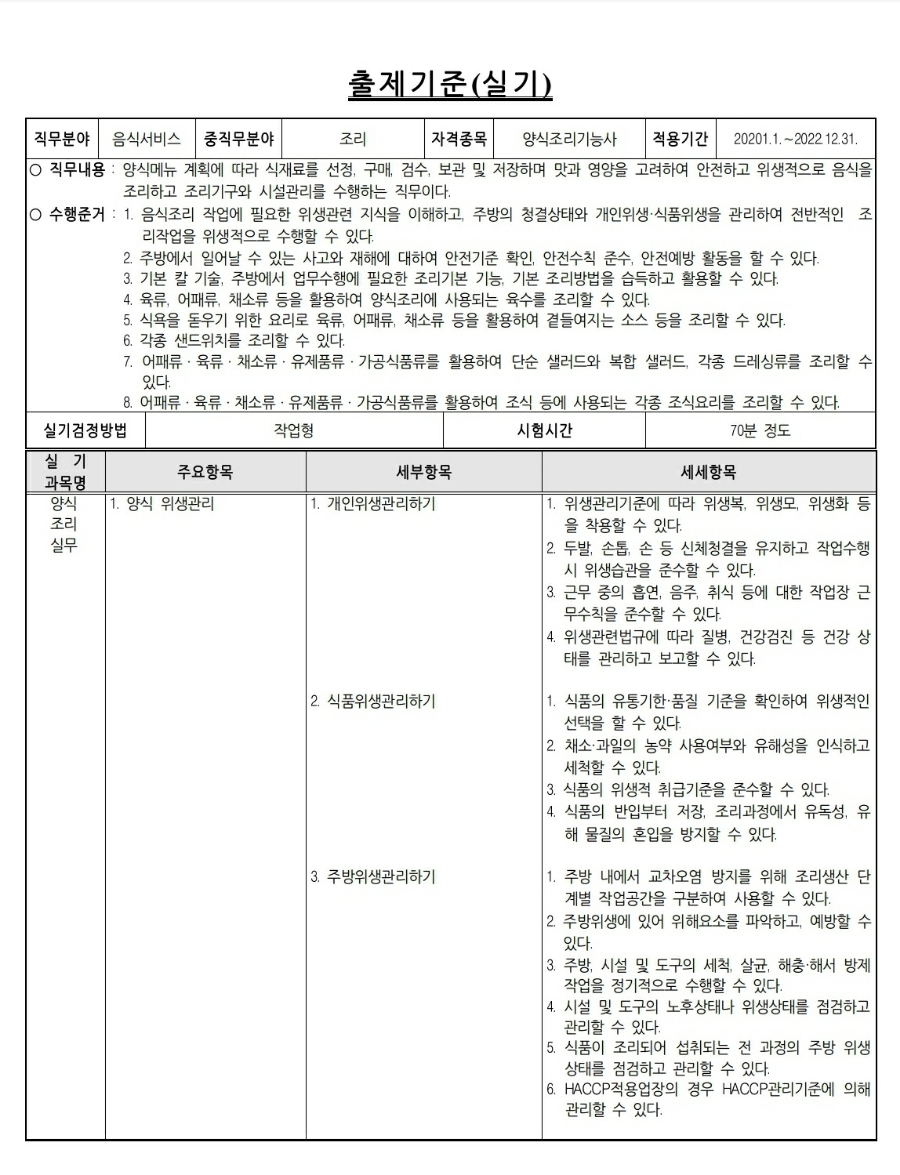 합격기준 양식조리기능사 필기: 100점 만점 60점 이상 양식조리기능사 실기: 100점 만점 60점 이상