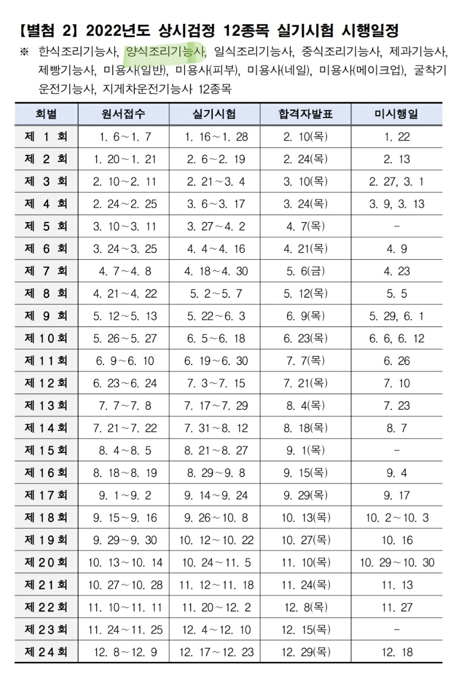 2022년 양식조리사 실기시험 24회 응시가능(상시기능사시험)
