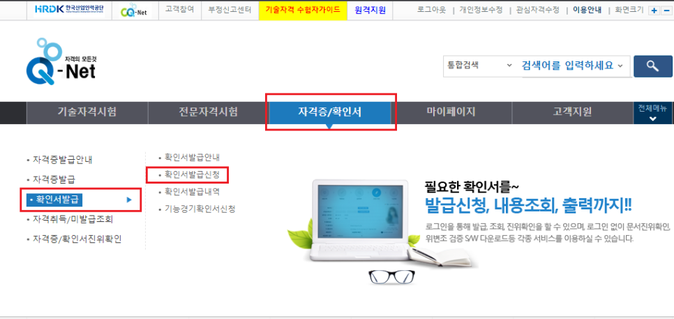산업인력관리공단 Q-net-자격증/확인서-확인서 발행-확인서 발급신청