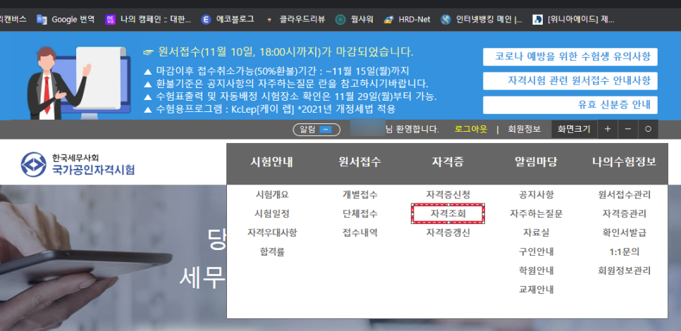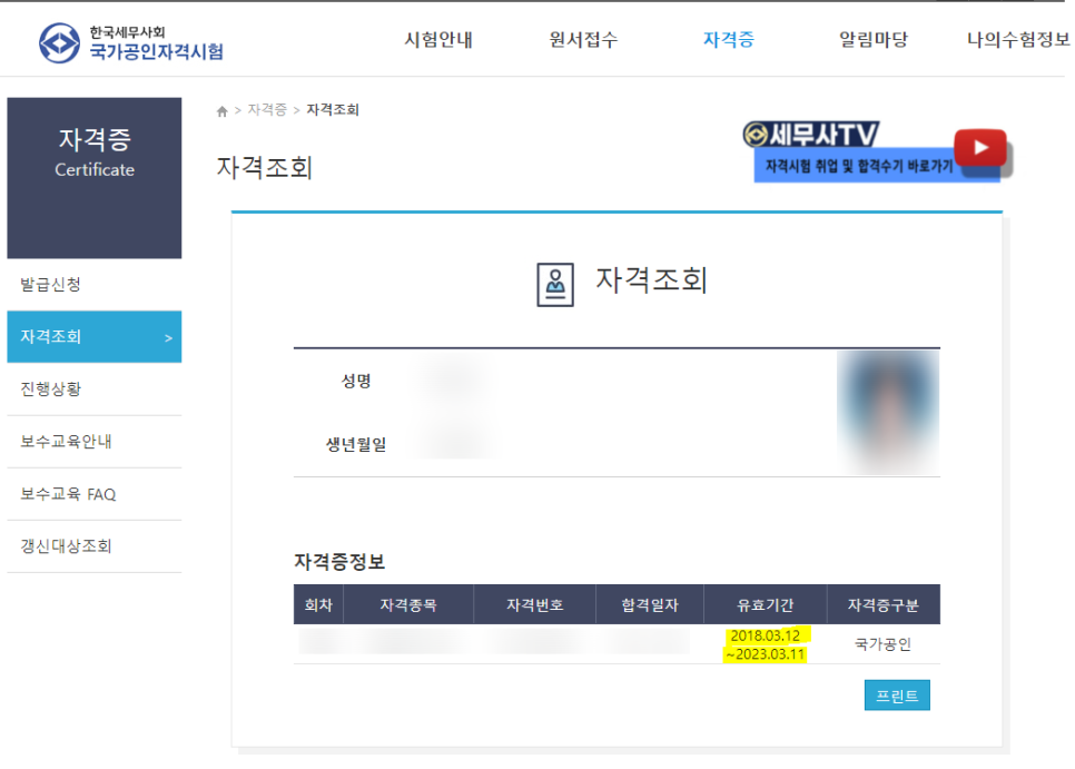 세무사회 자격증에는 유효기간이 적혀 있다.국가공인자격증의 경우 갱신기간에 보수교육을 이수해야 하고, 자격이 유효함을 확인하는 확인서를 받을 수 있으나, 자격증을 새로 발급받지 않아 유효자격증임을 확인할 수 없다고~ 자격조회확인서 필수