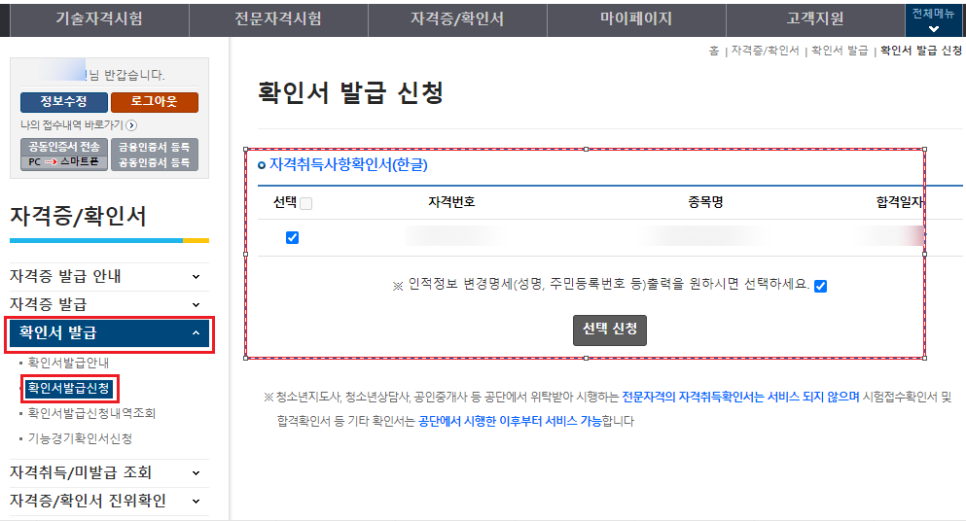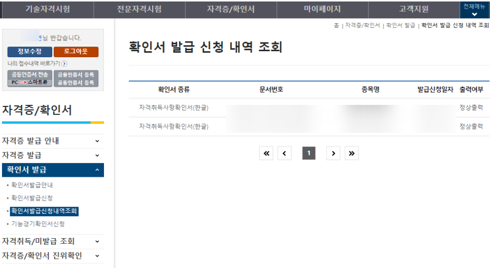 산업인력관리공단 Q-net-자격증/확인서-확인서 발급신청-자격취득사항확인서(한글)청소년지도사,청소년상담사,공인중개사 등 공단으로부터 위탁받아 시행하는 전문자격취득확인서는 서비스되지 않으며, 시험접수확인서 및 합격확인서 등 기타 확인서는 공단이 시행한 후 서비스 가능