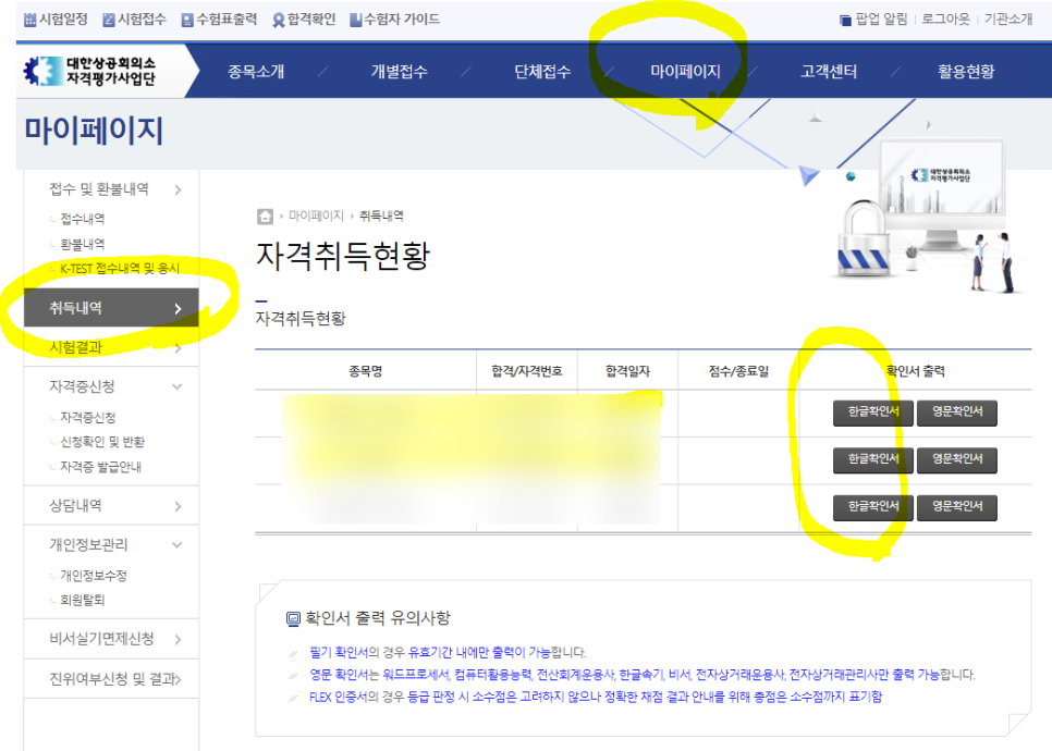 대한상공회의소→마이페이지→취득내역→자격취득현황(한글확인서/영문확인서) 필기확인서의 경우 유효기간 내에만 출력이 가능하나 PDF출력불가 영문확인서는 워드프로세서, 컴퓨터활용능력, 전산회계운용사, 한글속기, 비서, 전자상거래운용사, 전자상거래관리사만 출력가능