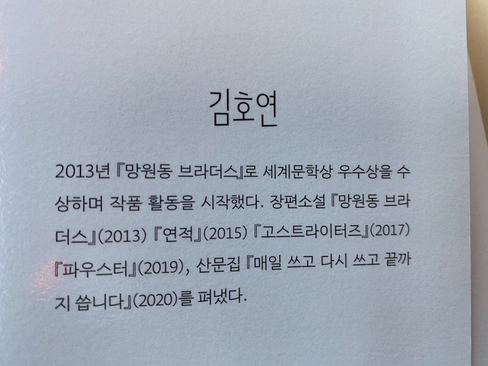 개인적으로 이 책은 나에게 용기를 주었다. 한강, 김영하, 박완서, 정씨 등의 소설을 읽으면서 소설가는 나와 다른 사람이라는 인식에 (시는 아예 포기) 잘하면 나도 소설을 쓸 수 있겠다는 희망적인 느낌이 들었다. 물론 비평은 쉽게 창작은 어렵다는 것을 잘 알면서도…