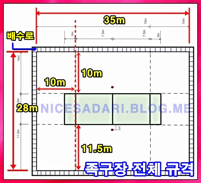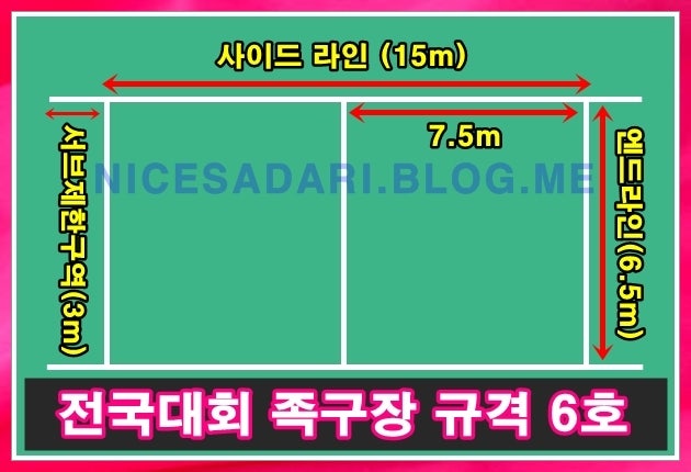 코트(라인) 규격네트높이와 함께 코트(라인)길이 규격도 알아보겠습니다.! 첨부된 사진을 참고하면 이해하기 쉽죠?사이드 라인의 길이는 7.5m 네트에서 라인의 끝까지의 길이라고 생각하시면 됩니다.엔드라인의 길이는 6.5m 왼쪽, 오른쪽 사이의 폭의 길이입니다.초등부의 경우에만 코트 규격이 줄어듭니다.사이드라인, 엔드라인 각각 1m씩 줄어듭니다!사이드라인 6.5m 엔드라인 5.5m 단, 여성부와 60대부의 코트 규격은 일반부와 같아!사진.서브지역(서브존)도 알아야 할 팁!코트 에어리어 뒤쪽에 3m짜리 서브 에어리어도 있어요!서브는 이 서브 에어리어 3m 이내에서 반드시 차야 합니다.3m를 벗어나거나 라인을 밟으면 서브 실점! 이에 주의해야 하며 서브를 넣기 전에는 공을 땅에 바운드해서 차면 안 됩니다!! 이것도 실점! 반드시 공을 손에 쥔 상태에서 바운드하지 말고 바로 차야 합니다.~족구규칙, 족구규칙을 잘 모르시는 분들은 이런 서브미스를 많이 하거든요, 동네 족구에서는 상관없겠지만 정식 족구규칙에서는 꼭 알아야 할 팁!대한민국족구협회 ci족구 규칙과 규칙을 어느 정도 이해하고 즐기시면 더 재미있습니다!우리 모두 건강하게 족구! 즐겁게 족구!족구룰&규칙을 알아보자 족구아 족구왕자입니다~ 족구입문 초보자들이 궁금해 헷갈리는 족구룰&…blog.naver.com족구룰&규칙을 알아보자 족구아 족구왕자입니다~ 족구입문 초보자들이 궁금해 헷갈리는 족구룰&…blog.naver.com족구룰&규칙을 알아보자 족구아 족구왕자입니다~ 족구입문 초보자들이 궁금해 헷갈리는 족구룰&…blog.naver.com