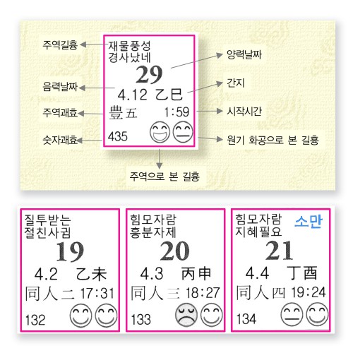 8. 오래전 7, 8년 전부터 개인 점쟁이를 사용하고 있습니다만, 이제 없으면 안 될 것 같습니다. 매일 책상 앞에 걸어놓고 매일 체크해요. 자세한내용을예전에는주역신묘산으로봤지만더찾기쉽고자세한주역의비결이나왔죠. 사용하기 쉬워졌습니다. 점차 업그레이드되는 운세여서 더욱 기대가 됩니다.