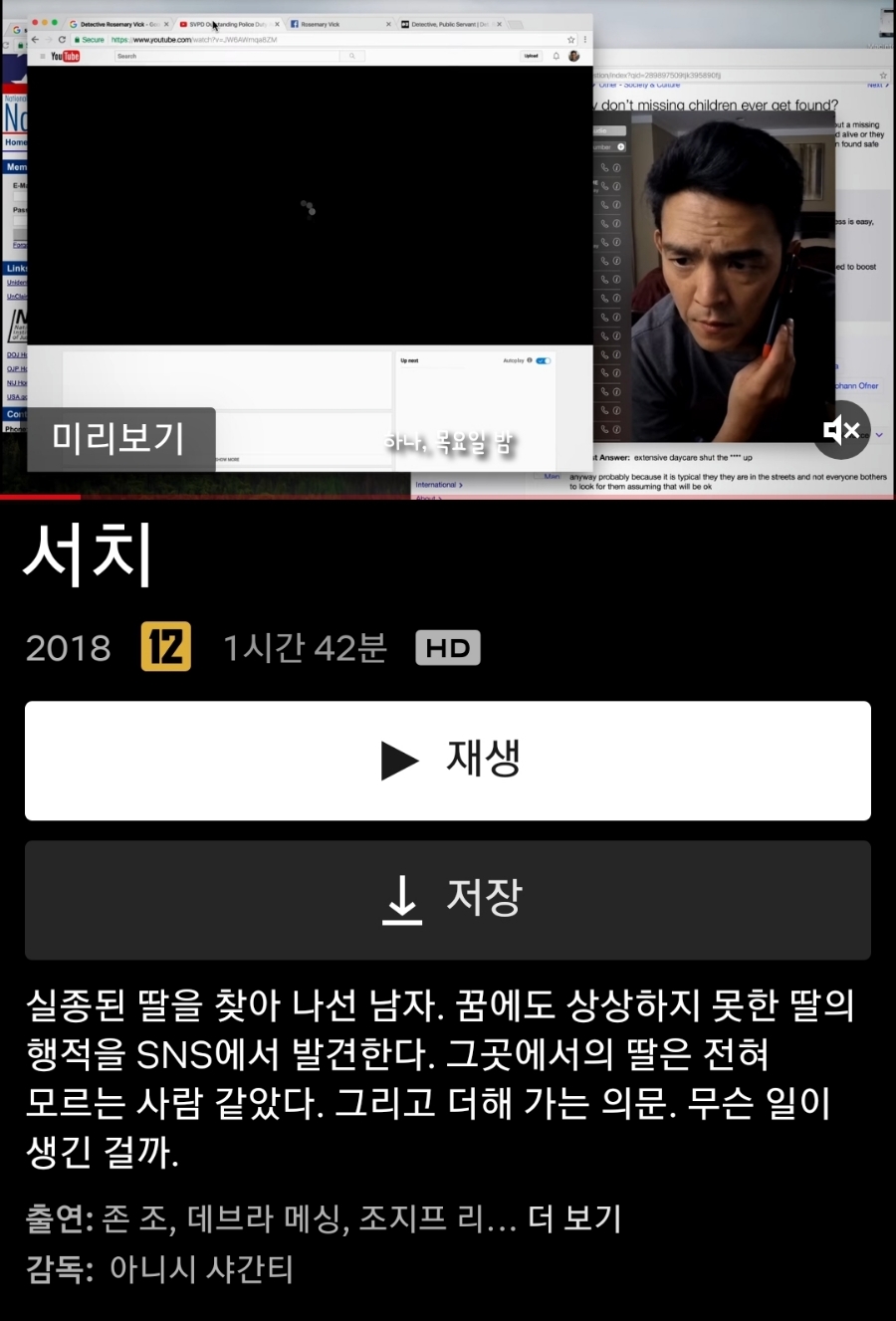 사라진 딸을 찾기 위해 아빠가 딸의 SNS를 찾던 중 대부분의 장면이 웹상의 모습으로 노출됩니다.풀수록 사건은 미궁 속으로 빠져들게…도대체 딸은 어디로 사라진 걸까요?제가 알던 딸의 모습이 진짜일까요?
