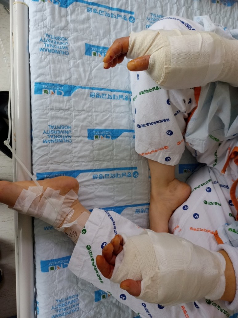 양손 수술 후 버팀목을 세워서 손목을 움직이지 못하게 감은 손