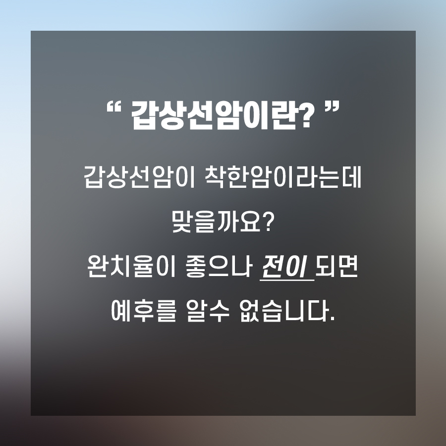 좋은 암이라고 불리는 갑상선 암, 왜 좋은 암이라고 불리는 것일까요?환자 본인이 발병했다는 사실을 몰라도 증식 속도도 느리고 생명에 지장이 없으며 수술 및 치료 효과도 좋고 예후가 좋아 이런 별명이 생기지 않았나 싶습니다.