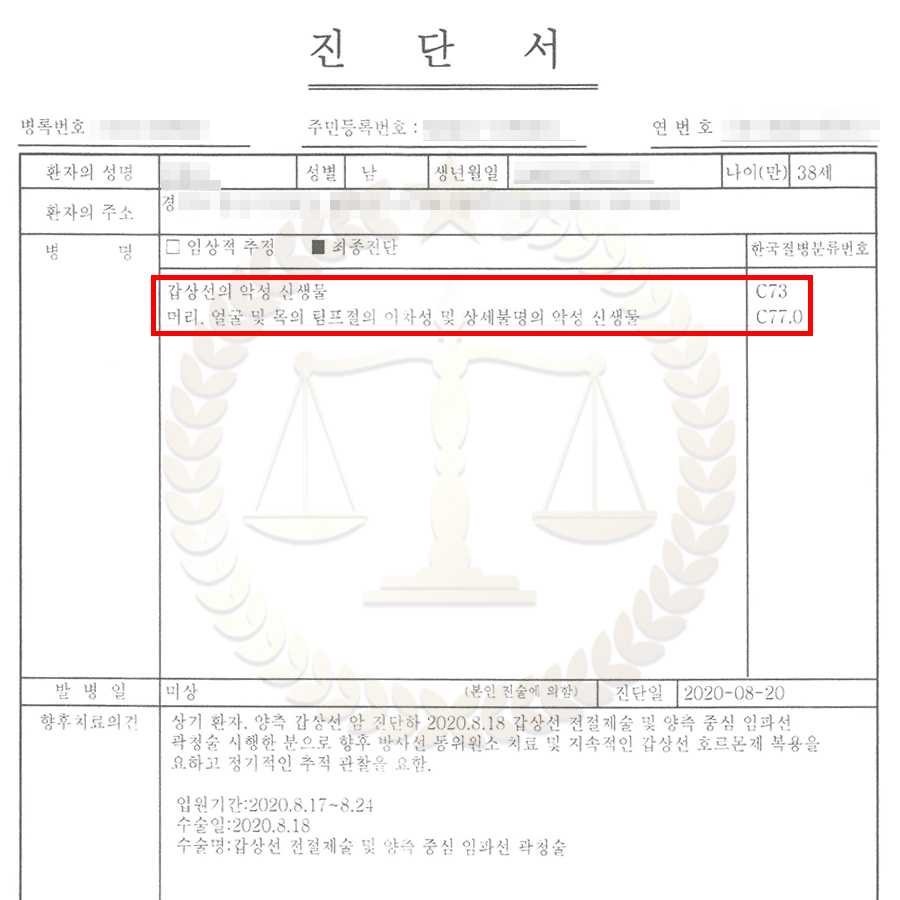 이러한 특징 때문에 보험약관에서는 C코드 C73임에도 소액암과 명확히 구분하여 일반암 진단비의 10% 정도만 보상하고 있습니다.
