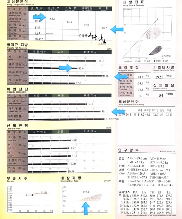 갑상선 질환으로 인한 비만, 체성분 검사 결과 체지방률이 39.1% 고도비만 체수분은 45%대(체중 118.2kg 중수분량 53.4kg) 근육량은 42.6kg 체지방량은 46.1kg 내장지방은 193.1cm2로,