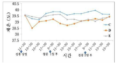 [도면 3] 미처리 대조군(C), 마보프록사신 및 톨페남산 복합 투여군(D) 및 마보프록사신 단독 투여군(E)에서의 체온 변화를 확인한 결과,