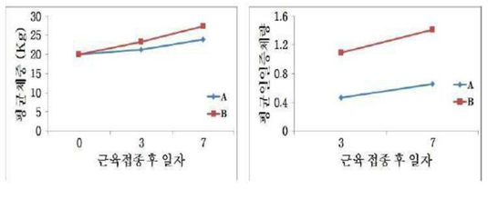 동물 건강에 이상이 유발되면 식욕이 감소하거나 체내 대사 불균형으로 인해 체중이 감소하게 되므로 이러한 체중 변화가 복합제제 투여군인 고용량 처치군에서 발생하는지 확인했다. 하루 증체량은 시험 개시 후 3일, 7일차에 각각 측정했다(도면 1). 그 결과 도면1에 나타난 바와 같이 복합제제를 고용량으로 접종해도 각 개체에서 체중감소가 관찰되지 않고 오히려 체중이 증가함에 따라 사료효율이 더 높아지므로 복합제제를 고용량으로 투여해도 우려할만한 부작용이 나타나지 않음을 확인했다. 따라서 복합제제는 안전한 약물로 돼지 개체에 사용할 수 있다.