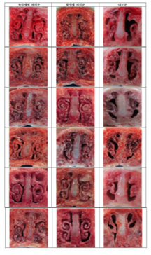 보다 구체적으로 비강상태를 확인하기 위해 개체를 전부 죽이게 한 후 방혈한 후 비강을 절개하여 위축성 비염에 대한 복합제제의 치료효과를 확인하여 도면2에 나타냈다. 결론적으로 대조군은 위축성 비염 유발균에 따라 정도의 차이는 있지만 비강에서 임상 증상이 관찰된 반면 처치군에서는 거의 정상과 같은 상태가 관찰돼 복합제제에 의한 유효한 효과가 관찰됐다.