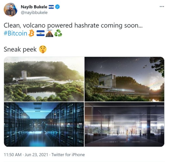 부케레 대통령은 인터뷰 후 자신의 트위터에 화산열을 이용한 비트코인 채굴공장 설계도를 공개했다. 그의 프로필 사진은 얼마 전 눈에서 레이저가 나오는 모습으로 일명 레이저 아이로 바뀌었다. 레이저 아이는 트위터에서 시작된 비트코인 상승 기원 밈(Meme)이다.