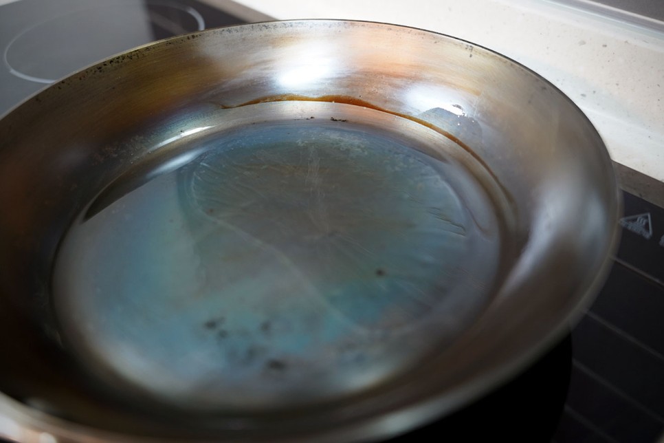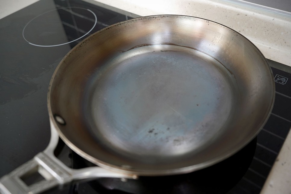 뜨거운 물로 프라이팬을 깨끗이 씻고 (세제금지!) 다시 불에 올려 말린 후 기름을 얇게 발라줍니다.