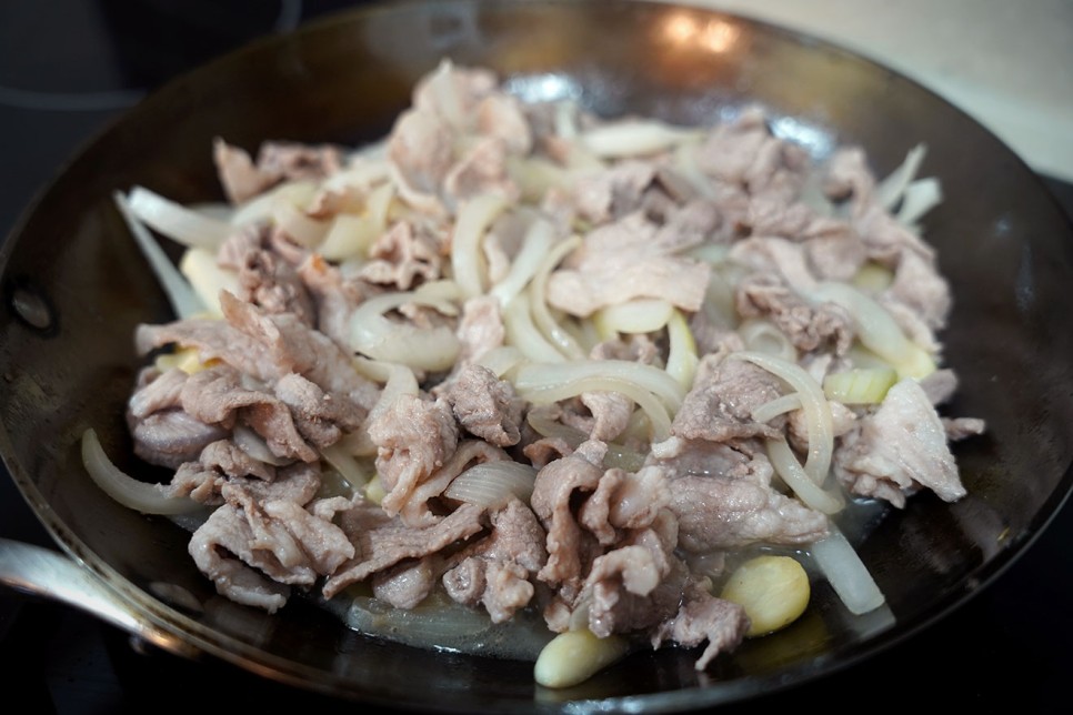 이름만 복잡하지만 제육볶음과 요리법은 다르지 않다.마늘과 양파를 팬에 볶다가 어느 정도 익으면 얇게 썬 고기를 넣고 함께 볶는다.고기는 어떤 고기든 상관없지만 오늘은 냉동실 돼지 앞다리살.